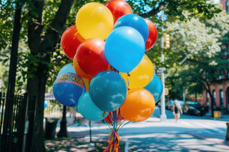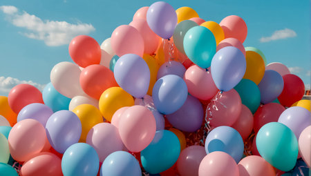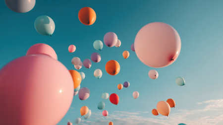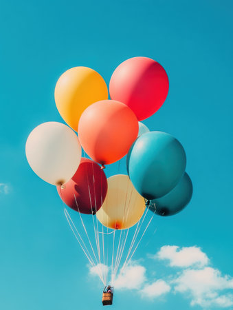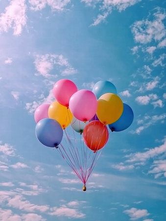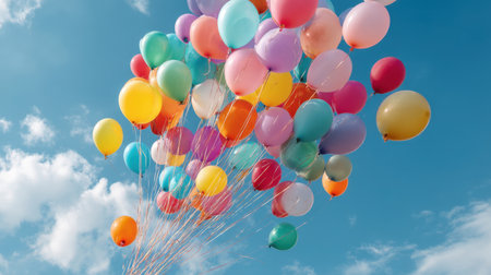 Colorful balloons float against bright sky, creating joyful and festive atmosphere. vibrant hues of yellow, red, blue, and pink add sense of celebration and happiness to scene