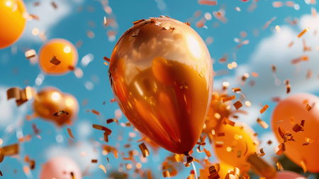 Golden balloons float in air, surrounded by shimmering confetti, creating festive atmosphere perfect for celebrations and parties. sparkling details add touch of elegance and joy