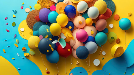A festive explosion of multicolored balloons and confetti against a light blue backdrop, symbolizing joy and celebration in a vibrant and dynamic composition.