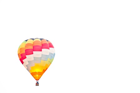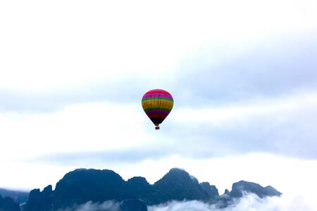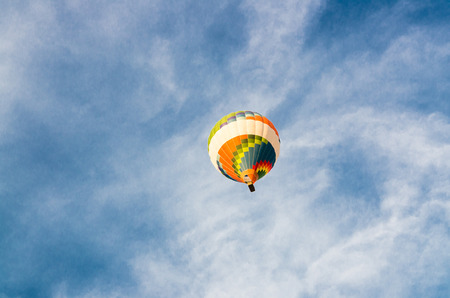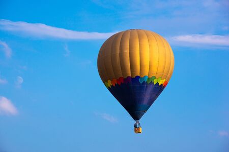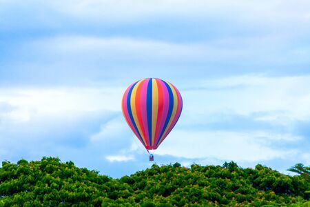 Landscape view of Colorful hot air balloon isolated flying view in the blue sky cloudy morning time Selective focus on the balloon.