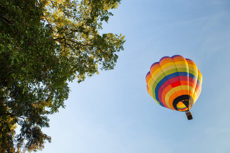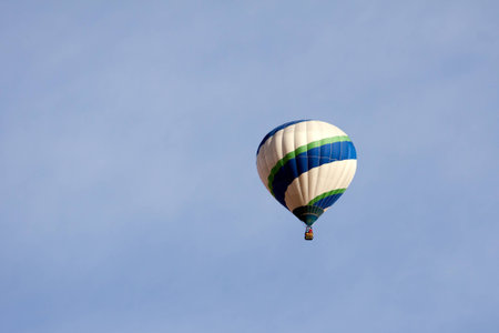 A vibrant hot air balloon glides gracefully across the expansive blue sky, enjoying a calm morning, highlighting the beauty of peaceful aerial adventures.