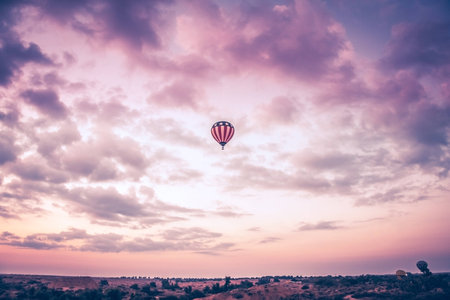 Hot-air balloon over Rose Valley and Goreme region at Cappadocia, Turkey.