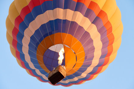 Caucasian man piloting hot air balloon, standing in basket while operating burner, large colorful balloon filling frame against clear blue sky, adventure travel concept