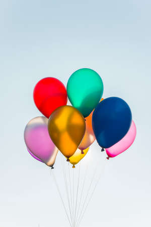 Multicolored balls, filled with helium, fly in the blue sky.