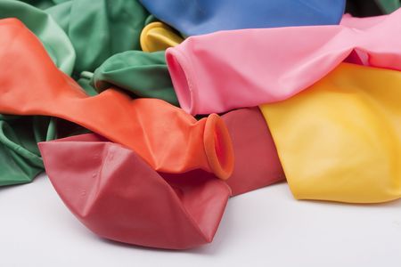 Colored deflated balloons on a white background with copy space