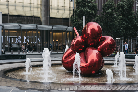 New York - May 31, 2018: Red Balloon Flower by Jeff Koons at 7 World Trade Center, New York, across from where the Twin Towers stood. The Flower is an homage to 9/11 survivors.