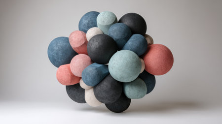 Various sized and shaped spheres and cylinders are grouped together, forming an abstract cluster.