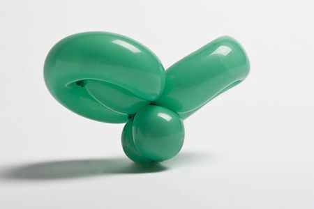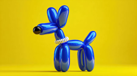 A blue balloon dog with a black nose is placed on a yellow background. The dog is made from twisted balloons.