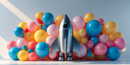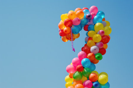A vibrant cluster of colorful balloons hangs against a gradient sky, creating a whimsical and joyful scene.