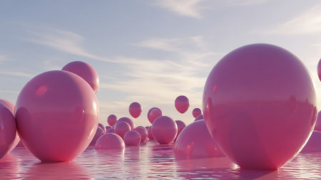 A serene landscape featuring numerous pink orbs floating in a clear sky, with some orbs reflecting light, creating a sense of tranquility and whimsy.