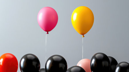 One brightly colored balloon floating higher than a cluster of monochrome balloons unique concept