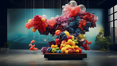 This vibrant digital artwork features colorful spherical shapes and bubbles set against a soft cloudy sky. The pastel hues and abstract forms create a whimsical and dreamlike atmosphere, perfect for backgrounds and artistic expressions.