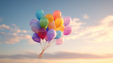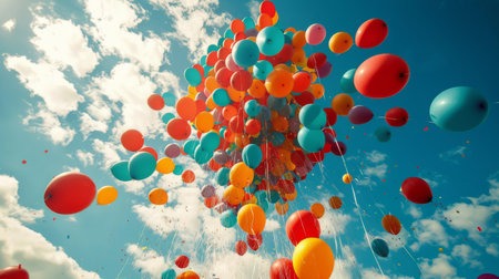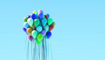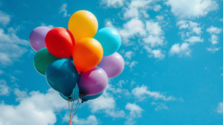 Colorful balloons floating against a clear blue sky for outdoor celebration. concept of joyful freedom, festive decoration, uplifting scenery, banner, copy space.