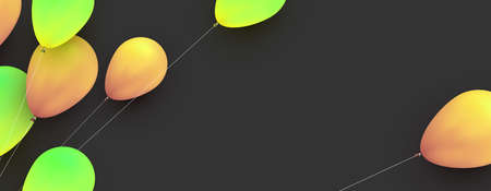 Yellow and green balloons with threads on black background. Space for text. Vector festive illustration.