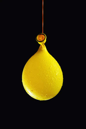 Yellow balloon with water hanging isolated on black background