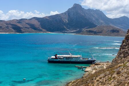 Balos Island Crete, Greece. May 1, 2015. Sea voyage on a sightseeing touristic ship. Amazing view from the mountain on blue water of Mediterranean Sea. Natural landscape. Gramvousa lagoon scenic view