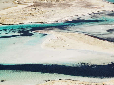 Aerial view of Balos beach near Gramvousa island in Crete. Magical turquoise waters, lagoons, Balos beach of pure white sand. Balos bay in Crete island, Greece.