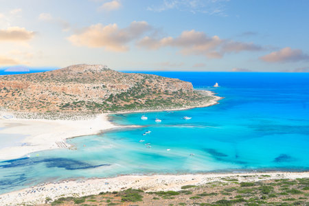Landscape with Balos Lagoon beach and Gramvousa island at sunset on Crete, Greece