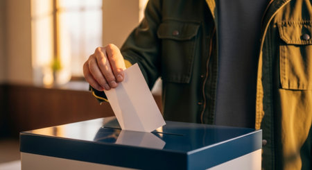 Hand placing blank ballot into neutral ballot box, symbolizing civic engagement and participation in elections