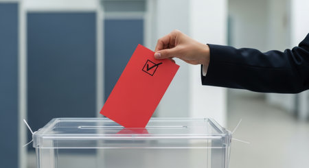 Hand of a voter dropping a red ballot paper with a checkmark into a transparent ballot box during an election or referendum.