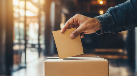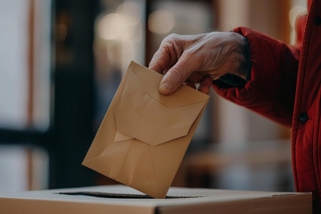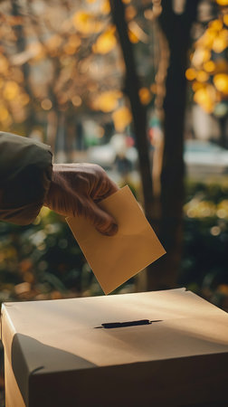 Closeup of a hand placing a filled voting envelope into a ballot box, symbolizing democratic participation