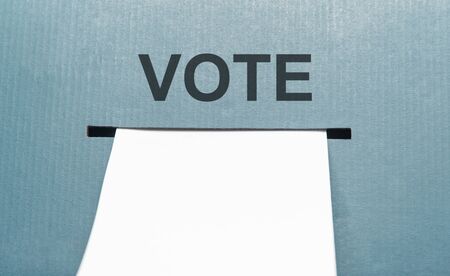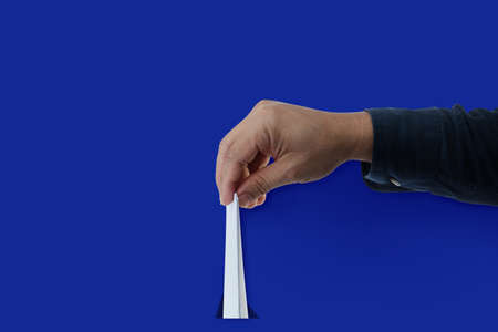 Blank ballot is inserted into a voting box, view from above. Elections. Copy-space.