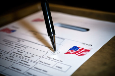 A close-up image of a hand casting a blank ballot into a box, against the backdrop of an American flag, symbolizing civic duty and participation in democratic elections.