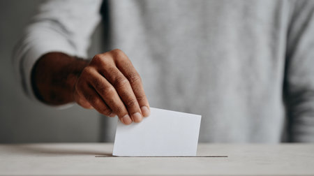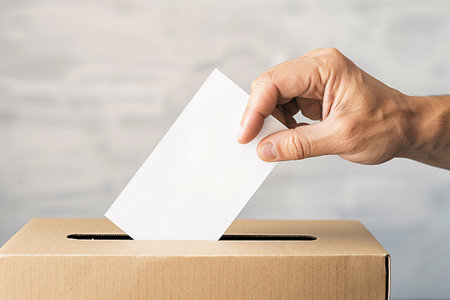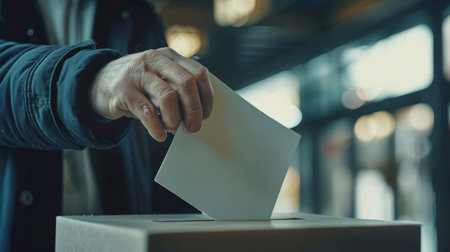 A hand is inserting a blank piece of paper into a ballot box, symbolizing participation in the voting process during an election, emphasizing civic duty and democracy.