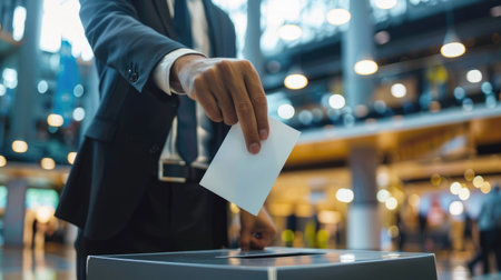 A person in a suit places a ballot paper into a voting box in a modern, brightly lit environment, highlighting democratic participation