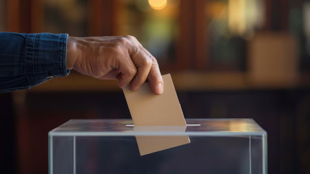 A hand places a ballot into a simple box under soft lighting, representing the act of voting and the democratic decision-making process