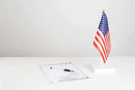 The pen and the ballot paper for the presidential election lie on the table, the American flag on a white background. US presidential election concept, copy space for text, democratic