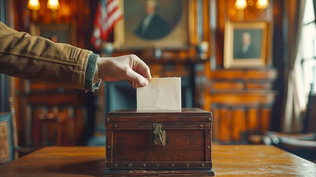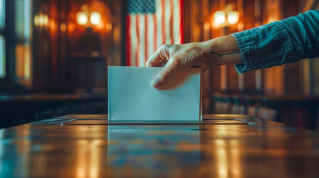 Hand placing a ballot into a wooden box with a blurred American flag in the background. Symbol of democracy and voting.