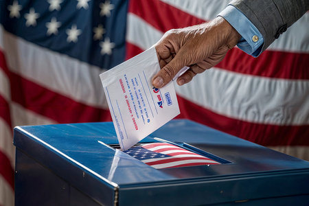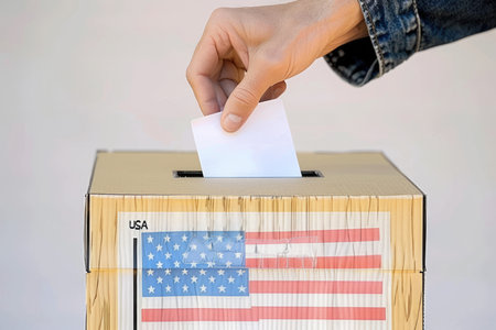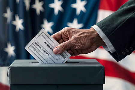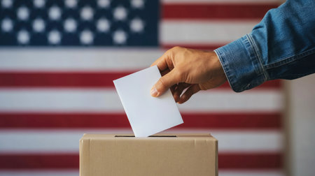 Hand casting a ballot into a voting box with an American flag in the background, representing democracy