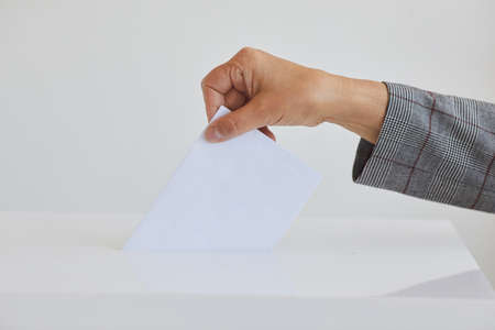 Close up of a person's hand inserting a blank envelope into a ballot box. Space for text.