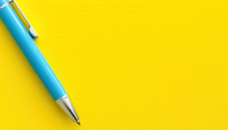 A blue pen on yellow surface, a functional writing tool for office that stands out with its vibrant color