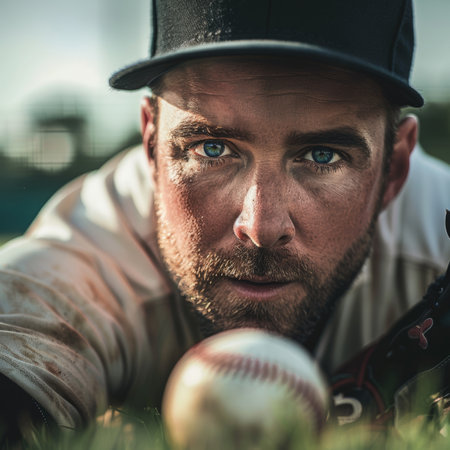 Determined baseball outfielder intensely focused on tracking a fly ball with unwavering eyes