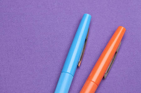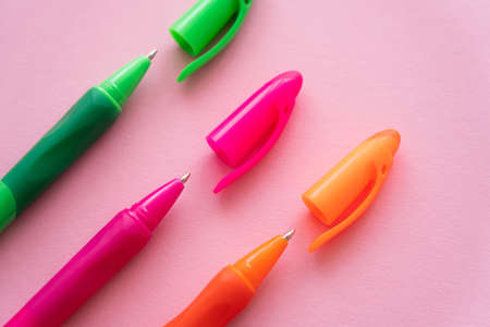 Four pens of blue, white, orange and gray are on a white background from above, from the side, at an angle. Four pens in close-up on a white background. Caps from pen