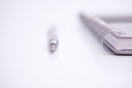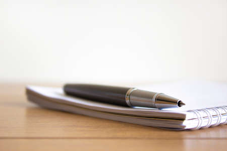 Business and office symbol. Notebook and pen on beautiful wooden table. Beautiful white background. Business and office concept.