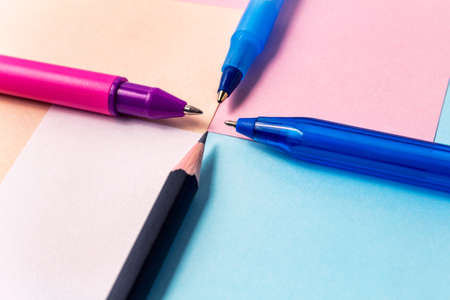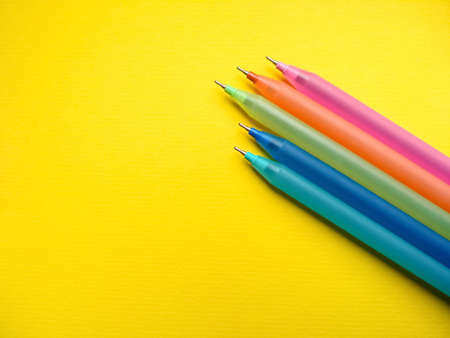Ballpoint pens of different colors lie on a yellow paper background. Close-up pens with copy space. School and office stationery.