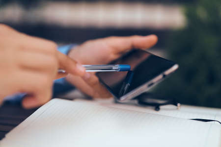 Male hand with metalic pen on beautiful white fon on warm light. Wooden picture frame and cap in the background.