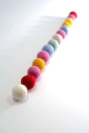 colorful felt balls in a row, focus in the foreground