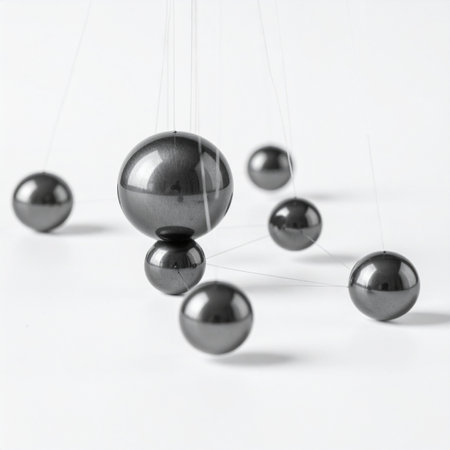 Sleek metallic spheres hover in perfect alignment over a glossy obsidian surface, reflecting soft ambient light to create a futuristic