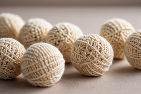A collection of tightly wound rope balls sits on a wooden surface