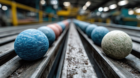 High-precision ball bearings are displayed on a textured surface in a workshop, showing their smooth surfaces and intricate designs essential for machinery.