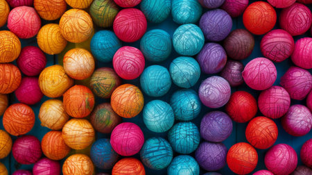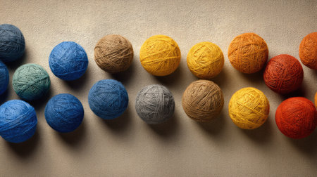 A vibrant collection of colorful yarn balls aligned on a textured surface, perfect for representing creativity and crafting hobbies in artistic projects.