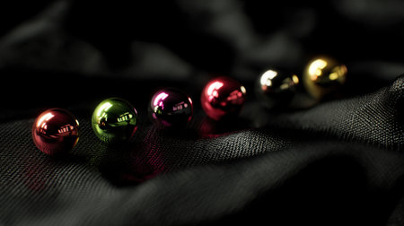 A captivating arrangement of colorful metallic spheres reflecting light against a textured black fabric background, creating a mesmerizing visual display.