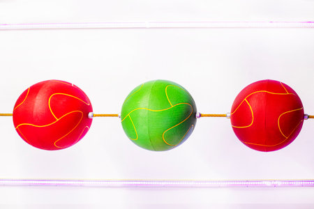 Small colored balls, red and yellow, on a blue background, placed in line, space for text