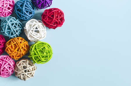 Balls of colored threads on a blue background. Decor made of colored threads on a light background of the mine space