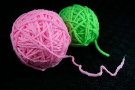 Green and pink wool yarn ball on black background