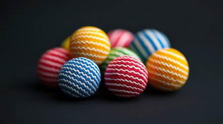 A vibrant arrangement of decorative balls featuring colorful striped patterns on a dark background, perfect for artistic and creative projects.